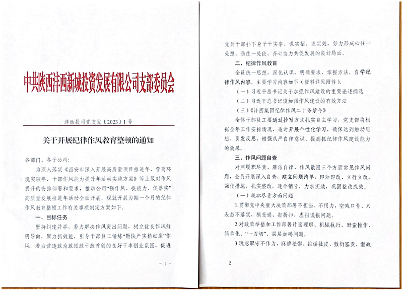 為深入貫徹黨的二十大精神,認(rèn)真落實集團干部作風(fēng)能力提升年的工作要求,灃西集團投資公司黨支部組織開展了系列干部作風(fēng)提升活動,積極打造作風(fēng)能力提升“陣地”,推動全體干部員工作風(fēng)能力提升。