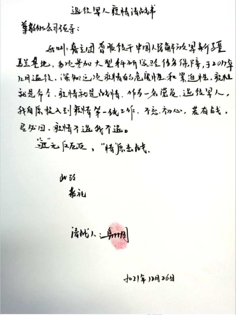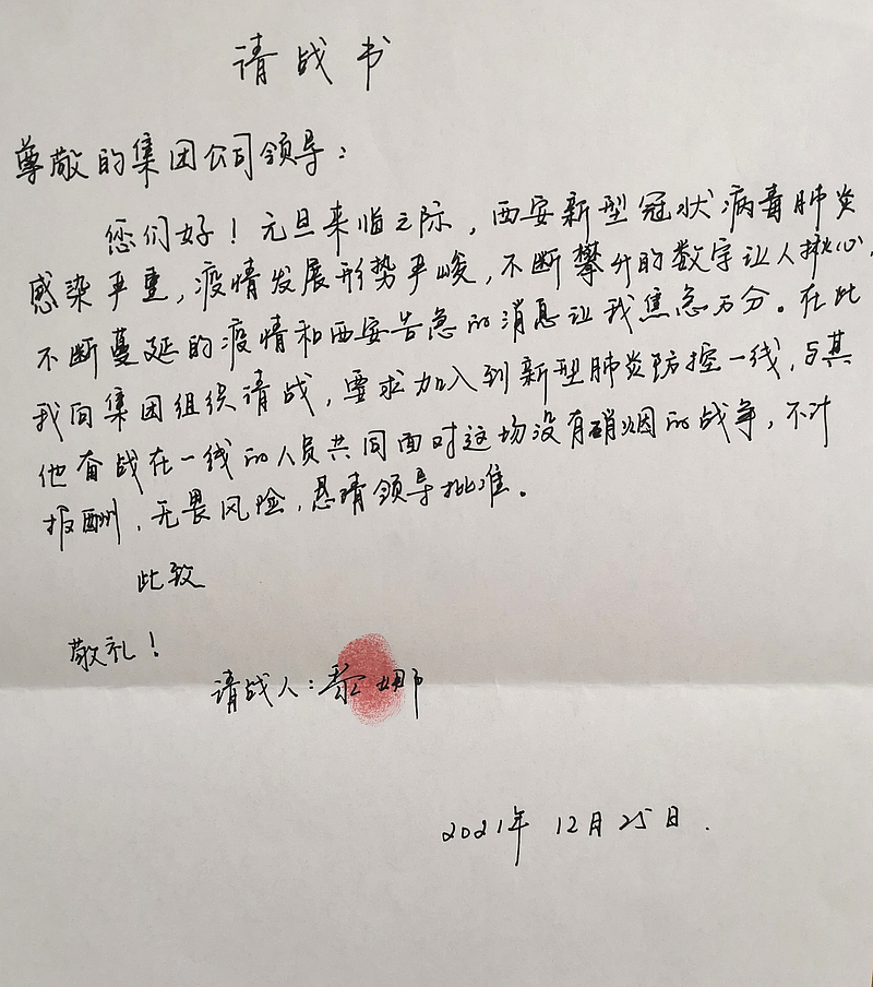 “本人居住小區(qū)未被封控,可以保證正常通勤,我向組織請(qǐng)戰(zhàn),要求做一線防疫、供暖保障人員,無(wú)畏風(fēng)險(xiǎn)、不計(jì)報(bào)酬!”這是一名80后員工,她叫王川,是灃西集團(tuán)下屬子公司能源公司的一名員工,在防疫工作開始后,她一貫沖在前干在前,值班時(shí)總是要求第一班。為了讓其他同事可以休息,可以輪休的情況下依然堅(jiān)持每天到公司到崗上班,保證工作不斷檔。公司在防疫執(zhí)勤點(diǎn)排班時(shí)主要安排男同志,但身為女同志,她多次申請(qǐng)前往一線。12月27日,在全市新一輪核酸檢測(cè)行動(dòng)開始前,王川同志主動(dòng)手寫請(qǐng)戰(zhàn)書,再次要求到一線防疫!目前在灃西新城馬王村開展防疫工作。