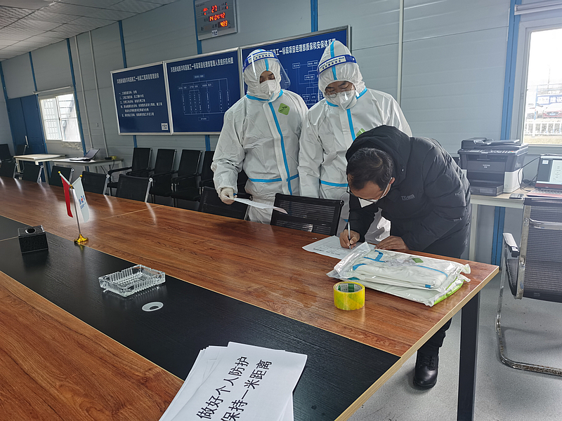 12月29日凌晨2點(diǎn)多,周瑞杰仍然帶領(lǐng)防疫一線的同志們緊急開展布置檢測(cè)現(xiàn)場(chǎng)、安排專人對(duì)接、清點(diǎn)防疫物資等各項(xiàng)工作。早上7點(diǎn),東方欲曉,項(xiàng)目核酸檢測(cè)點(diǎn)前期各項(xiàng)準(zhǔn)備工作一切就緒,周瑞杰臉上終于露出了欣慰的笑容,與同志們連夜作戰(zhàn)了近5個(gè)小時(shí)未休息的他卻說,“我辛苦些沒什么,咱不能讓項(xiàng)目上的兄弟們?cè)庾铮 ?/p>