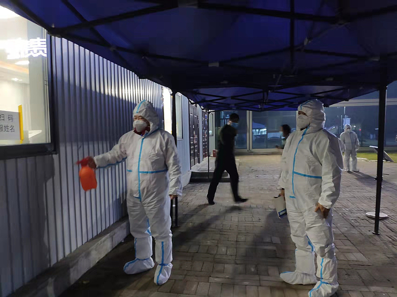 負(fù)責(zé)協(xié)調(diào)對(duì)接核酸檢測(cè)小組工作人員、檢測(cè)現(xiàn)場(chǎng)執(zhí)勤及項(xiàng)目生活區(qū)巡查工作的張建文已經(jīng)連續(xù)奮戰(zhàn)近20個(gè)小時(shí)了,同事們讓他去休息一下,他卻說“沒關(guān)系,還能堅(jiān)持!”晚上20:00,他和同事們已完成了當(dāng)天的核酸檢測(cè)工作,引導(dǎo)工人們有序離開檢測(cè)現(xiàn)場(chǎng)后,張建文仍然堅(jiān)持著清理完畢所有設(shè)備,確保完成最后一次消殺后才放心離開。