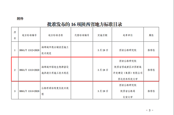日前,陜西省市場監(jiān)督管理局批準(zhǔn)發(fā)布了16項陜西省地方標(biāo)準(zhǔn),并于3月28日正式實施。由灃西集團、西安公路研究院、西北農(nóng)林科技大學(xué)聯(lián)合編制的《海綿城市綠地生物滯留設(shè)施滲濾介質(zhì)施工技術(shù)規(guī)范》(DB61/T1313-2020)位列其中,這是灃西集團承擔(dān)的10余項海綿城市省級地方性標(biāo)準(zhǔn)編制任務(wù)中首批成果。