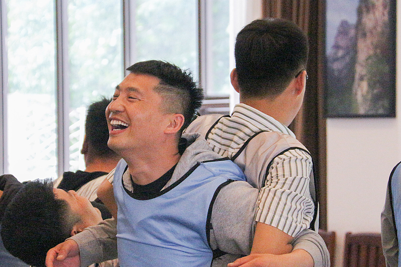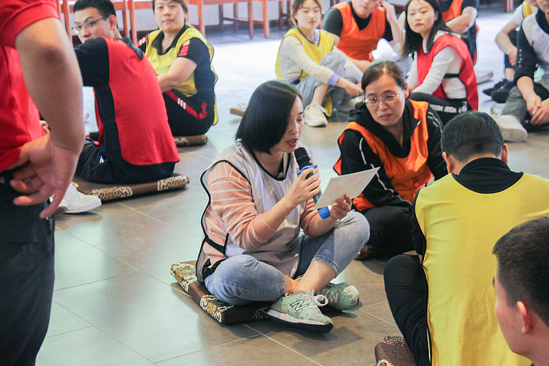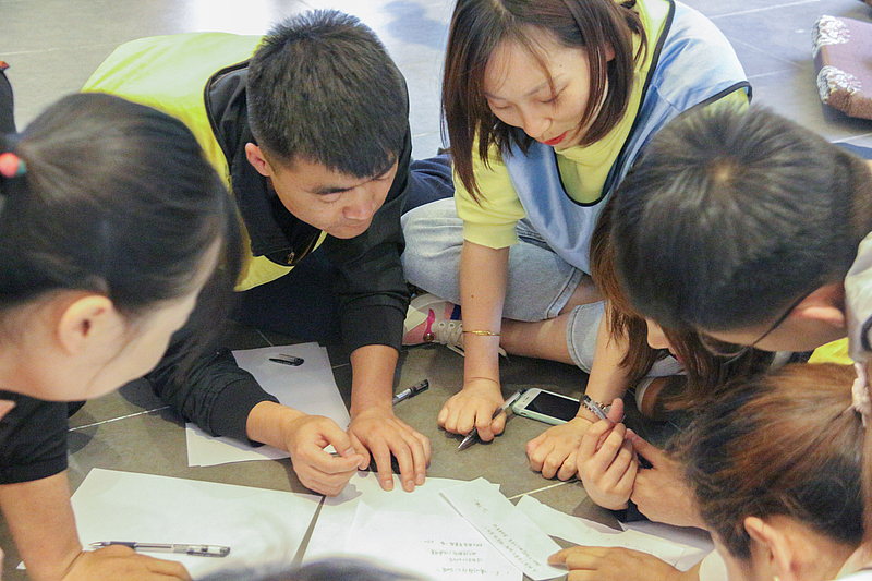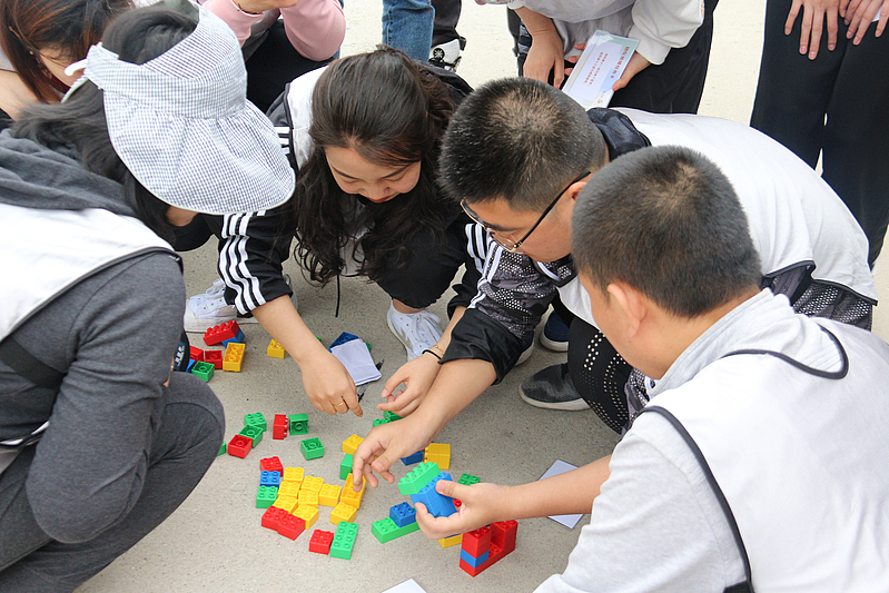 在“創新思維”和“啞人筑塔”活動環節中,需要各隊員在規定的時間內有序完成各項挑戰任務。計時開始后,每支隊伍都全身心投入活動中,小分隊間的合作也更加得心應手。夏風輕拂,大家的興致也愈發高漲,不一會兒就有隊員示意教練已完成任務。