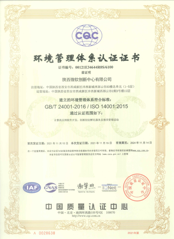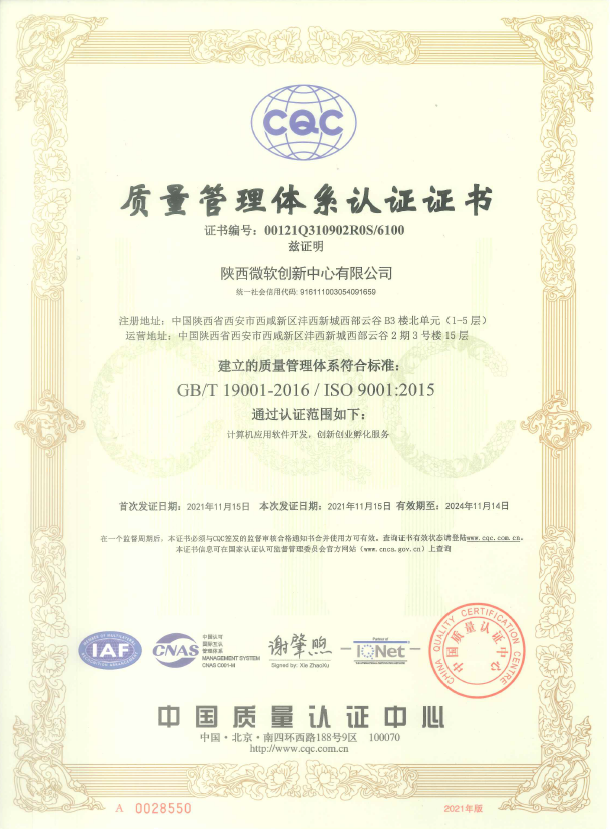 11月22日,陜西微軟創(chuàng)新中心有限公司(以下簡(jiǎn)稱“陜西MIC”)順利取得中國(guó)質(zhì)量認(rèn)證中心與國(guó)際互認(rèn)聯(lián)盟頒發(fā)的QES管理體系認(rèn)證證書(質(zhì)量管理體系<計(jì)算機(jī)應(yīng)用軟件開(kāi)發(fā)與創(chuàng)新創(chuàng)業(yè)孵化服務(wù)>、環(huán)境管理體系和職業(yè)健康安全管理體系認(rèn)證證書)。