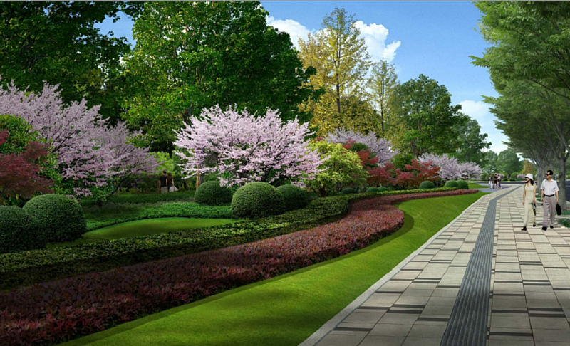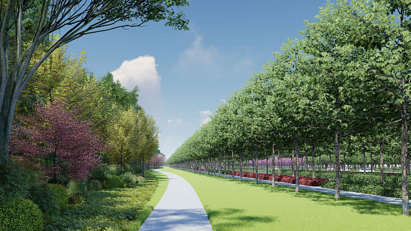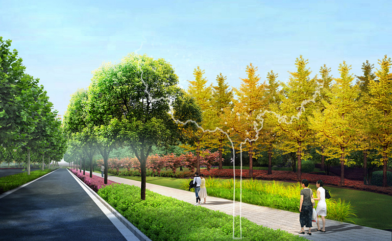 為城市主干路景觀配套,全長(zhǎng)1.6公里,綠化面積約9萬(wàn)平方米。該路段通過(guò)栽植高大喬木法桐、油松、國(guó)槐等鄉(xiāng)土樹(shù)種,端頭點(diǎn)綴組團(tuán)植物群,致力于構(gòu)建自然生態(tài)的植物景觀,營(yíng)造休閑舒適的品質(zhì)街景。計(jì)劃于2023年完成相關(guān)區(qū)域地形整理及綠化栽植施工。