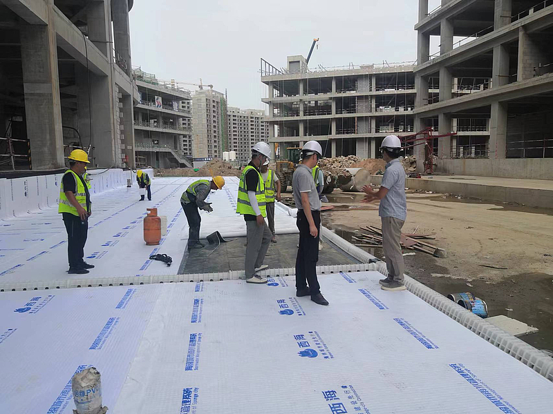 傳統(tǒng)地庫頂板排水技術(shù)構(gòu)造層次復(fù)雜,施工不便,且排水效果受找坡層影響較大,同時隨著陸面地表海綿城市建設(shè)的推廣,進(jìn)一步增加了頂板排水壓力,尤其是大面積的車庫頂板,因找坡難度大,極易引起排水系統(tǒng)不暢,從而造成積水,引發(fā)滲漏。