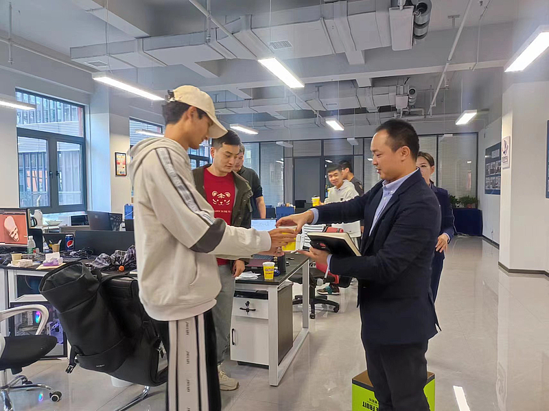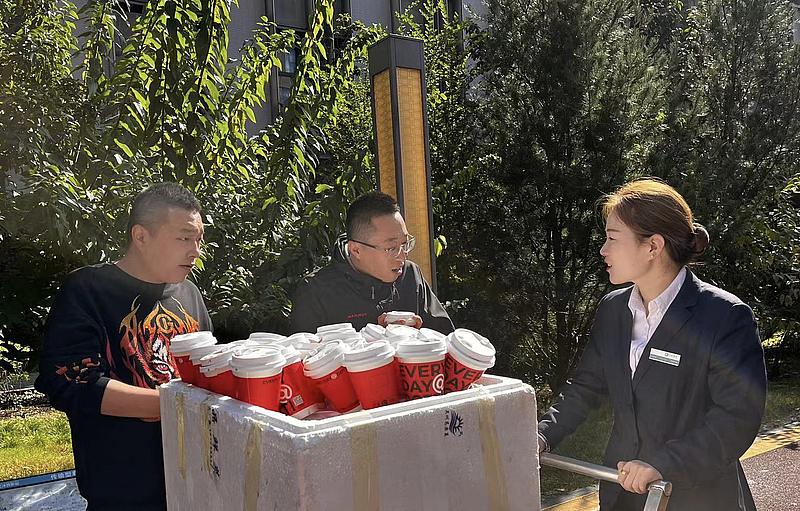 園區物業人員將分裝好的熱茶,送至企業員工手中,與企業溝通近期經營情況,詢問企業遇到的問題與困難,將企業反饋的意見和建議一一登記,及時回復并解決。