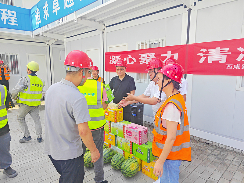 活動中,西咸信息產業園有關負責人帶隊前往鯤鵬智造園、灃云智造園和灃翼現代智造園項目建設現場,將西瓜、飲料、藿香正氣水等防暑降溫物資送到一線工人手中,感謝他們為園區建設作出的貢獻。