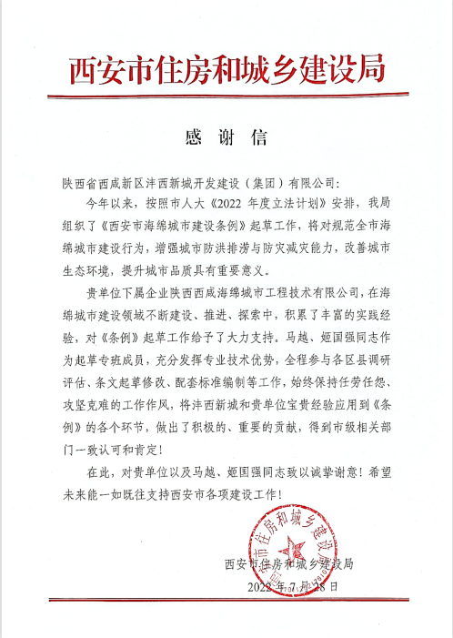 近日,灃西集團收到一封來自西安市住房和城鄉建設局的感謝信,信中對集團下屬企業陜西西咸海綿城市工程技術有限公司協助編制《西安市海綿城市建設條例》過程中展現出的專業水平與職業素養表示高度認可與贊揚。感謝信指出,作為《西安市海綿城市建設條例》起草專班團隊,海綿城市技術公司充分發揮實踐經驗豐富、專業技術領先等優勢,全程參與各區縣調研評估、條文起草...