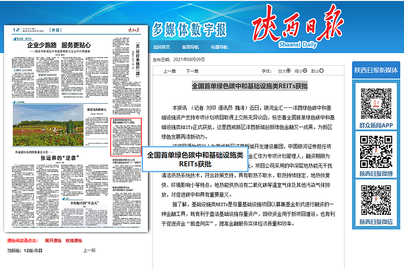 本報(bào)訊 (記者 劉印 通訊員 魏濤)近日,銀河金匯——灃西綠色碳中和基礎(chǔ)設(shè)施資產(chǎn)支持專項(xiàng)計(jì)劃項(xiàng)目取得上交所無異議函,標(biāo)志著全國(guó)首單綠色碳中和基礎(chǔ)設(shè)施類REITs正式獲批,這是西咸新區(qū)灃西新城創(chuàng)新綠色金融又一成果,為新區(qū)綠色發(fā)展再添新動(dòng)力。