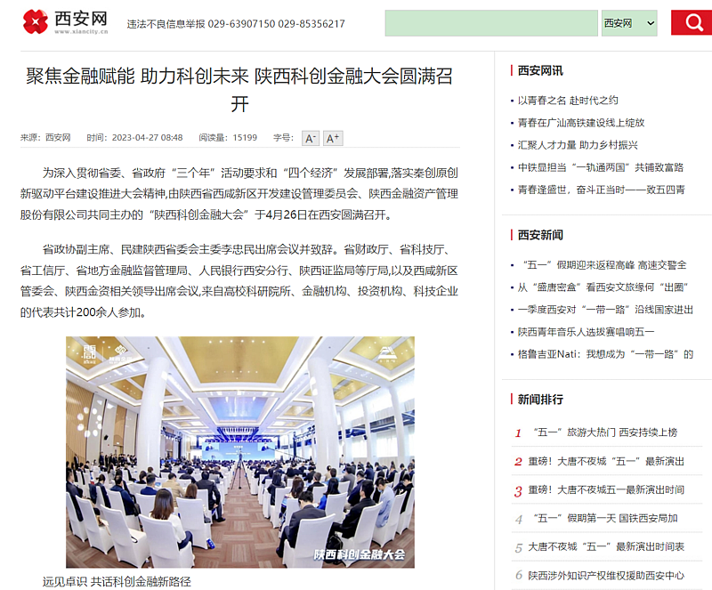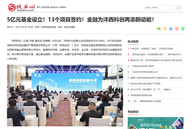4月26日,陜西科創(chuàng)金融大會在西咸會議中心舉辦。本次活動由西咸新區(qū)和陜西金融資產(chǎn)管理股份有限公司(下稱“陜西金資”)主辦,陜西金資基金管理有限公司和西咸新區(qū)灃西新城基金管理有限公司承辦,邀請政府領(lǐng)導、金融專家、科學家、企業(yè)家、投資機構(gòu)共同探討金融服務科創(chuàng)、助力秦創(chuàng)原發(fā)展之路,通過基金揭牌、項目簽約、金融產(chǎn)品發(fā)布等系列重磅舉措為秦創(chuàng)原科技創(chuàng)新建設注入新動能。